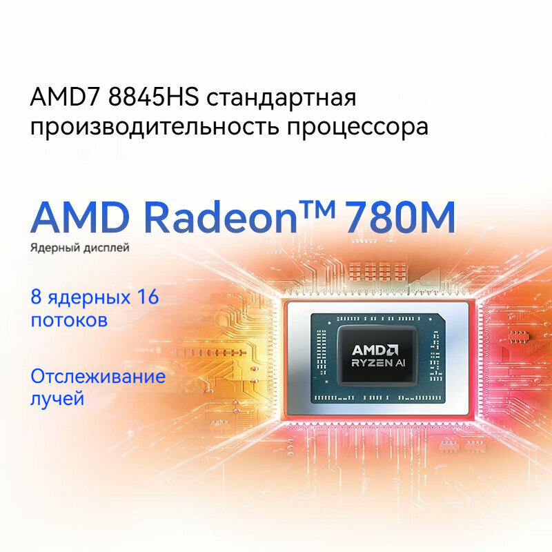 Процессор: Оснащен новейшим процессором AMD R7-8845HS, использующим архитектуру Zen 3+, с 8-ядерным 16-поточным процессором, базовая частота которого составляет 3,2 ГГц, а максимальная частота ускорения может достигать 4,7 ГГц.Это позволяет ноутбуку поддерживать бесперебойную работу при параллельном выполнении сложных задач и многозадачности.
