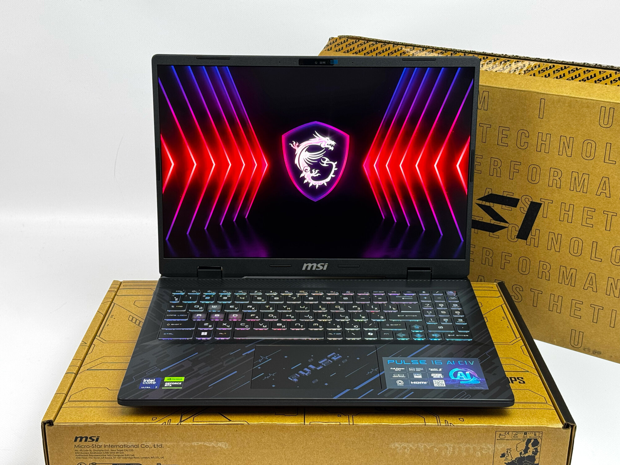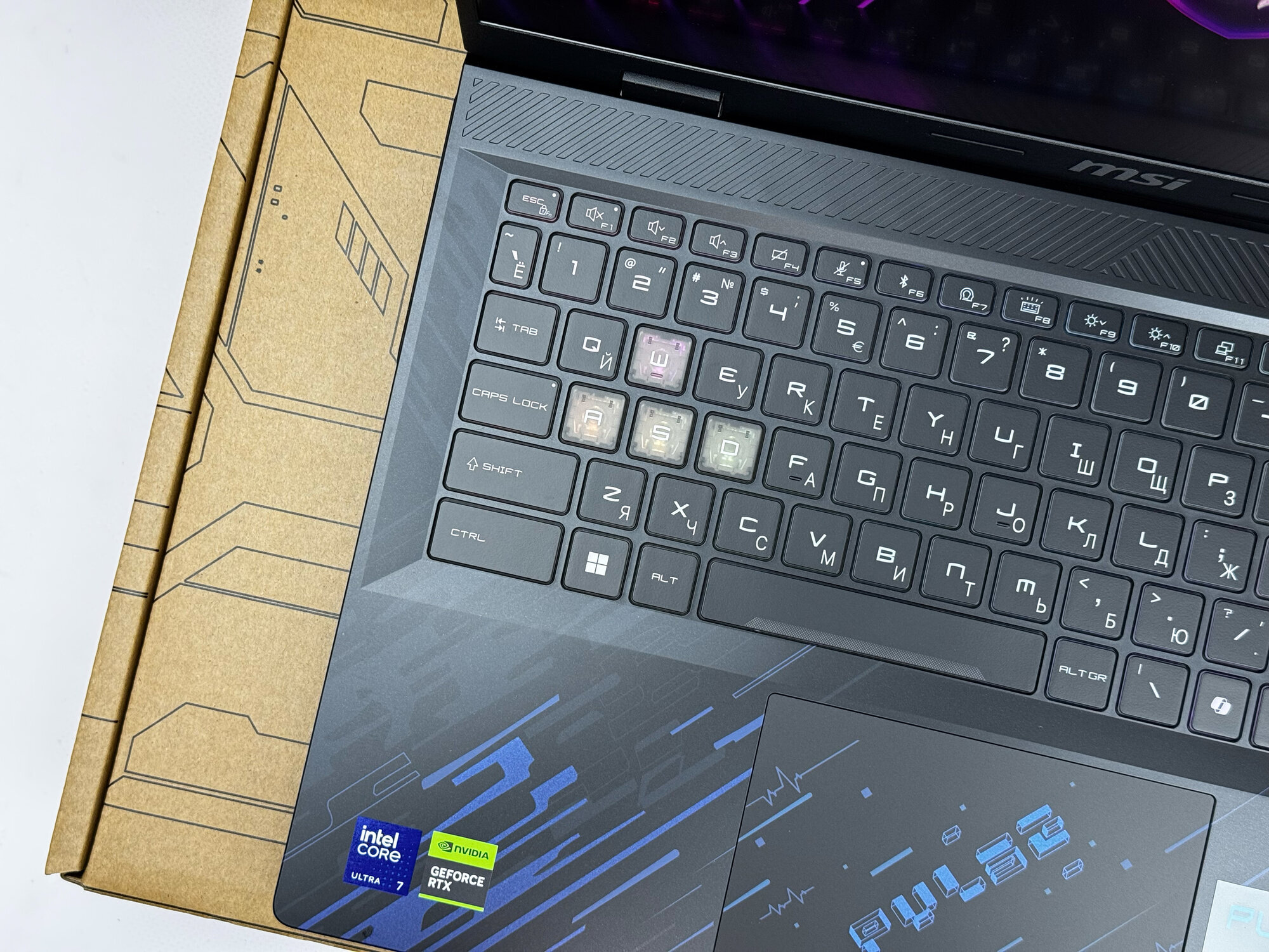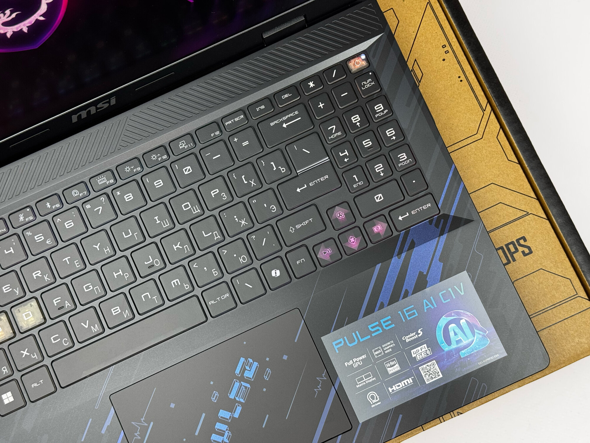 Русско-английская клавиатура ноутбука MSI Pulse обеспечивает удобство и комфорт при наборе текста, а также при игре.